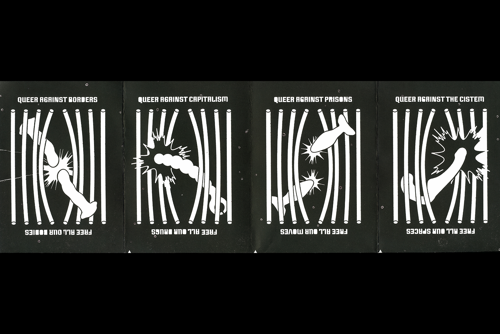 La trame de fond est effectivement l’activisme ; j’ai commencé à militer dans des associations trans en 2010 et je me définis comme transféministe. J’ai majoritairement gravité et œuvré pour les luttes et les droits des personnes TPBG, et j’ajoute, principalement avec ma casquette de designer*e, c’est à dire en mettant mes capacités de graphiste au service du collectif. La théorie queer m’a aussi totalement emportée parce qu’elle invite directement à penser en terme d’intersectionnalité. Les questions de race et de classe sont imbriquées dans ses racines, avec les revendications posées dans les années 90 par la Queer Nation, composée d’un petit groupe de personnes racisées, précaires et/ou trans. Le queer propose donc de faire éclater les catégories de sexes, de genres et de sexualités, avec son fameux leitmotiv FUCK TON GENRE FUCK TON SEXE FUCK TA SEXUALITÉ ; de se positionner donc dans un instable constant, toujours en mouvement et en mutation, mais pas sans penser, intégrer les autres stigmatisations vécues par d’autres corps mis à la marge.