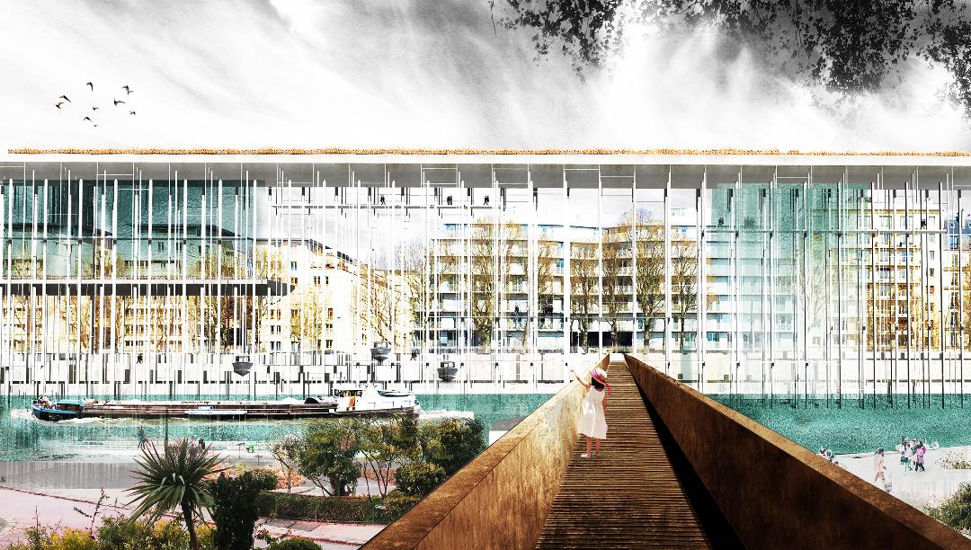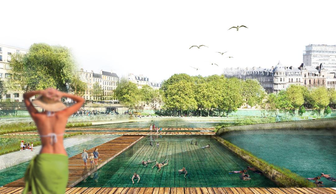 Changement d’échelle avec Alexia Boulay, ex-étudiante de l’ENSAPLV, désormais architecte et ingénieur en bâtiment indépendante qui présente, sous les yeux de Luis Lopez, son ancien enseignant à La Villette, son projet de fin d’études aux accents visionnaires : “Manifeste d’une Seine Réenchantée”. Entre projet (Simon Jacquemin réagit très vite en pragmatique en demandant le chiffrage financier) et utopie, elle présente sur des planches soignées un projet de monument dépuratif devant l’Île Saint-Louis pour offrir le bras nord de la Seine à la baignade. Attentive à sonder la Seine depuis son cours – et non plus ses berges – elle partage les enseignements d’un long travail de documentation (faune et flore de la Seine, trafic des bateaux, courants, aménagements successifs au cours de l’histoire, historiographie….) et ses projections poétiques qui, si elles n’ont pas vocation première à être réalisées (trop de freins administratifs, budgétaires, symboliques) viennent questionner efficacement la manière dont le fleuve est perçu et géré aujourd’hui. L’occasion de riches échanges avec Luis Lopez, Alexandra Cohen (CUESTA), Joan Pronnier et Nicolas Defawe (Urban Spree) tandis que Simon Jacquemin, en contradicteur ou objecteur de conscience, prend en main la modération d’une discussion qui ouvre son cercle à mesure : étudiants, public et membres du Collectif MU prenant tour à tour la parole.