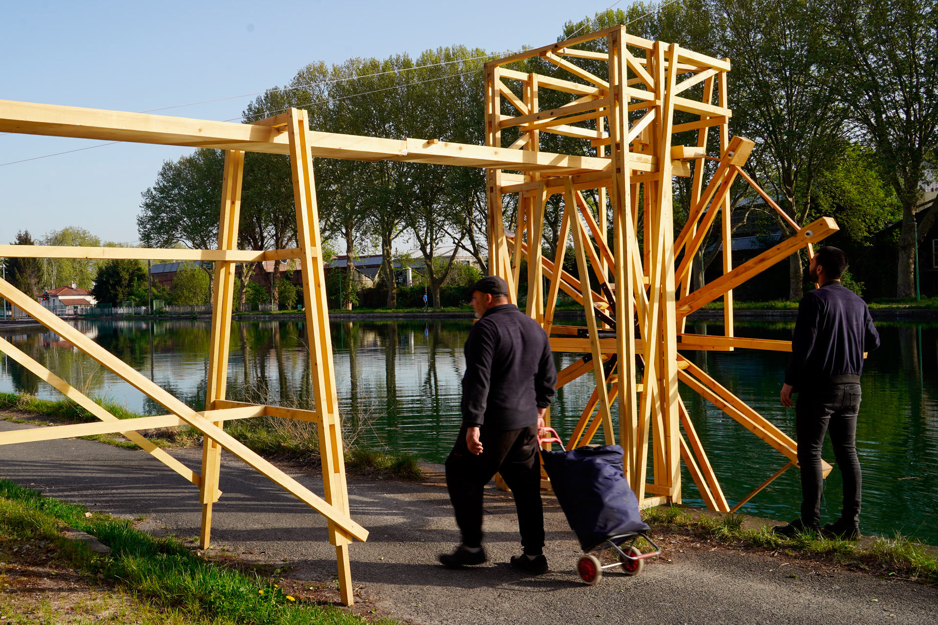 Dans le dos de la péniche Thabor, le regard se porte alors sur une drôle d’apparition flottante à l’allure bancale et précaire : quatre jeunes gens avancent en pédalo sur un tamis monté sur bidons, couvert par une structure complexe de bambou et de textile. Ça fleure bon le Jules Vernes, un peu le Burning Man, beaucoup Théo Jansen, et ce qui ressort à la vue des shorts détrempés des passagers – presque étonnés que l’embarcation puisse flotter (la plateforme sur laquelle les calculs de flottaison ont été effectués déclinait toute responsabilité en cas de naufrage) – est avant tout la bonne humeur généralisée, la satisfaction d’avoir fait advenir cette drôle de machine en si peu de temps. Car La Galinette, c’est le nom de l’invention, est issue d’un workshop produit par le Collectif MU, encadré par l’Atelier Craft, collectif de designers, architectes, plasticiens et scénographes résidents à la Station – Gare des Mines, avec un groupe d’étudiants de l’Ecole Nationale Supérieure d’Architecture de La Villette, animé par l’enseignant et sociologue franco-mexicain Luis Lopez. A la genèse du projet, une question : comment rendre visible un dispositif de traitement et de filtration de l’eau du Canal Saint-Denis ? Les étudiants ont réalisé un état des lieux des différentes techniques de filtration, avant de réfléchir à la forme – plastique, architecturale, sensible – à même de faire du dispositif opérationnel à la fois un totem, un manifeste, une interface de sensibilisation et un générateur de débats. La Galinette se compose (dans sa partie bambou / textile) d’un projet qu’Harold Le Bihan, Damien Favale, Rémy Lenoir et d’autres étudiants ont rendu flottant, et dont les premiers principes de l’unité de filtration à venir sont rendus visibles : une roue en bois pour puiser l’eau, l’autonomie du dispositif mobile. Les étudiants de l’ENSAPLV et de l’Atelier Craft évoquent les partis-pris et doutes qui ont précédé la mise en forme de ce prototype, ce qui ne manque pas de susciter interrogations, remarques et rebonds de la part du public et des intervenants rassemblés ici.